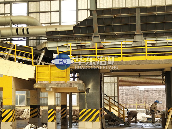 鏟車將廢舊電瓶放入振(zhèn)動給料倉,經振動料倉均勻進入上料運送機,運送機把電瓶送入雙刀粗碎機(jī),粗碎機(jī)通過雙刀將電(diàn)瓶破碎至(zhì)30mm左右寬度的條(tiáo)狀塊,落入下麵的鉛酸振動(dòng)分離機,電瓶裏的酸會落入下層收集器,通過管道送入酸水收集罐集中處理,鉛和塑料通過上層篩網進人二次細碎運送機,運送機把鉛和塑料送入細碎(suì)機,細碎(suì)機加水通過錘片對物料進行細碎,加水的作用是利用細碎(suì)機錘(chuí)頭,在轉動破碎時(shí)更充分的對鉛(qiān)塑清洗分離(lí),達到粒(lì)度的鉛塑.通過細碎機篩孔隨水一塊進入鉛(qiān)塑分(fèn)離機,通過水的重力分選鉛和塑料,塑料漂浮(fú)在水麵被撥輪撥到前麵出塑(sù)口落下收集,鉛的比重大會沉入水底,經螺旋出料(liào)機(jī)將鉛粒拉(lā)出送入滾筒脫水機,鉛泥會落入前麵的出水口進入沉澱池,經螺杆泵送入(rù)壓慮機進行(háng)壓(yā)慮脫水,鉛泥會被壓慮(lǜ)機過濾,等待和鉛混合壓餅加工,水流入(rù)過濾水池,經水泵再送入破碎機循環使用,脫水後的鉛裏會含有比重大的塑(sù)紙和(hé)重塑(sù),經運送機再送入負壓風篩經二次分離(lí),塑料和塑紙(zhǐ)會被風抽走,比重大的鉛會(huì)落下來(lái)進入收集器收集,破碎係(xì)統全程工作流程,無廢水流出汙(wū)染環境,鉛會再次加工,塑料也會再次回收利用,采用水介質分離避免了工人在生產過程中的鉛中毒,減輕了工人的(de)勞動強度。另一方麵(miàn),把板柵材料和鉛泥分開,提高了爐料的鉛品位,從(cóng)而減少了煙氣、棄渣和煙塵數(shù)量,減少能耗,提高金屬回收率、工效和產能,有利於環境保護 。