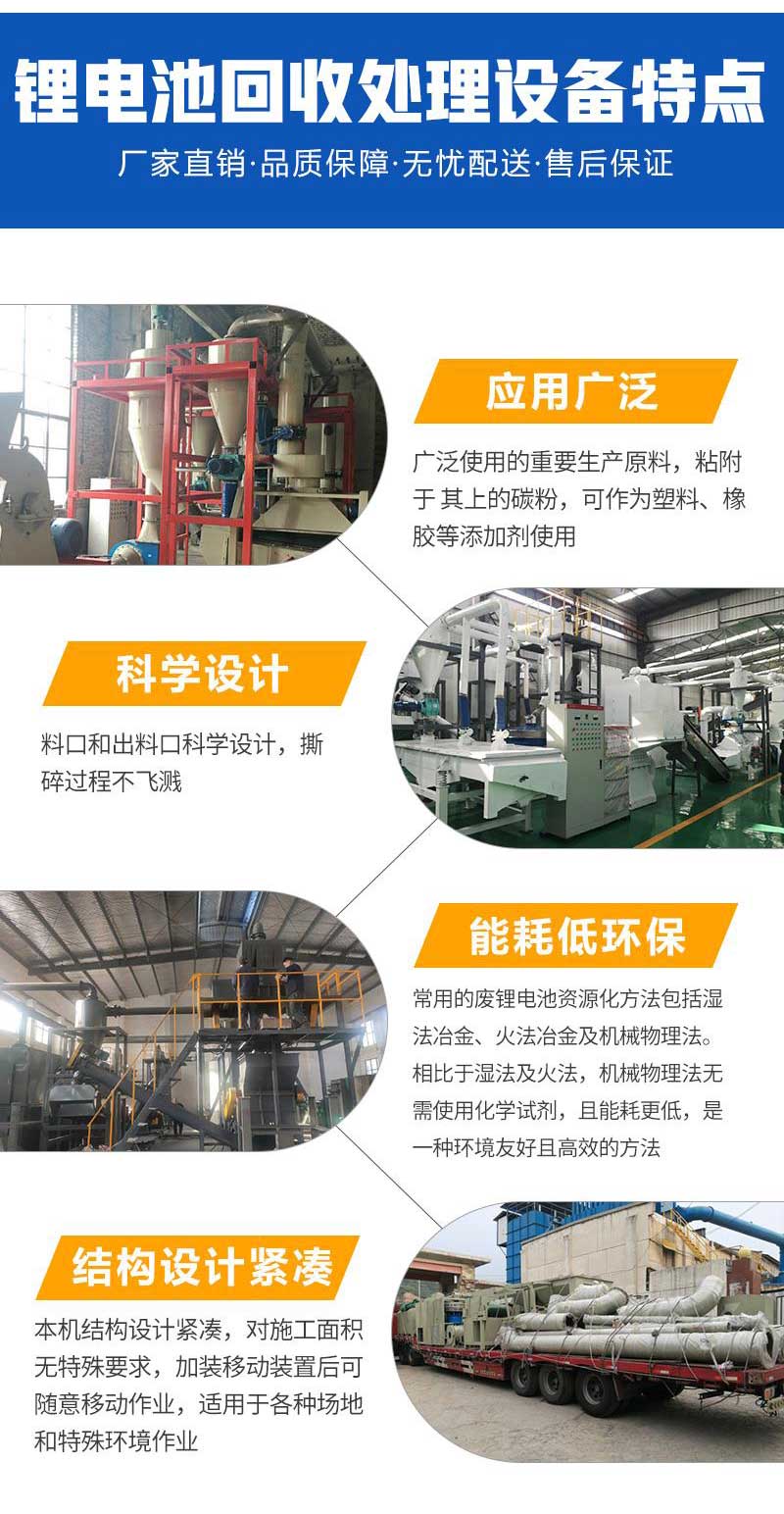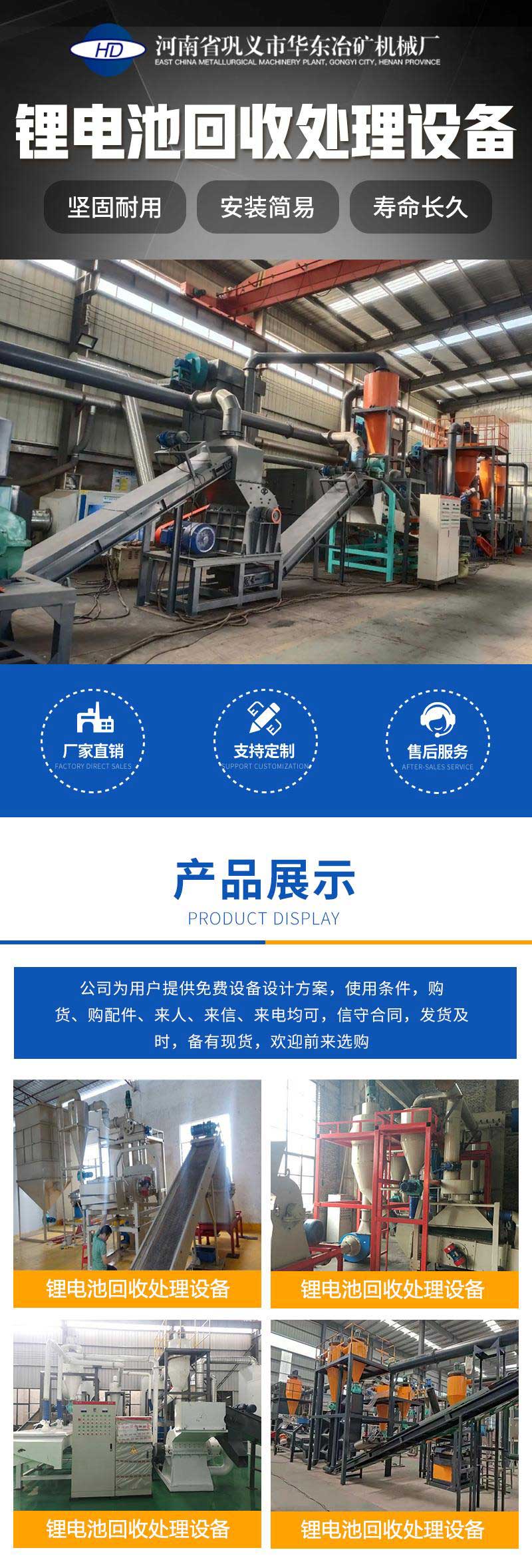 鋰電(diàn)池處(chù)理設備有多種類型,可根據處理的電池來(lái)選擇處理設備,我們為您提供免費(fèi)的設備定(dìng)製服務(wù)!
